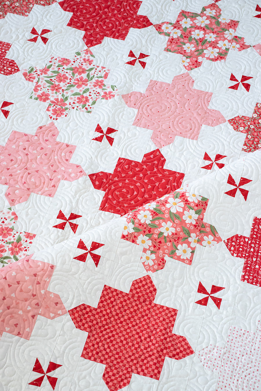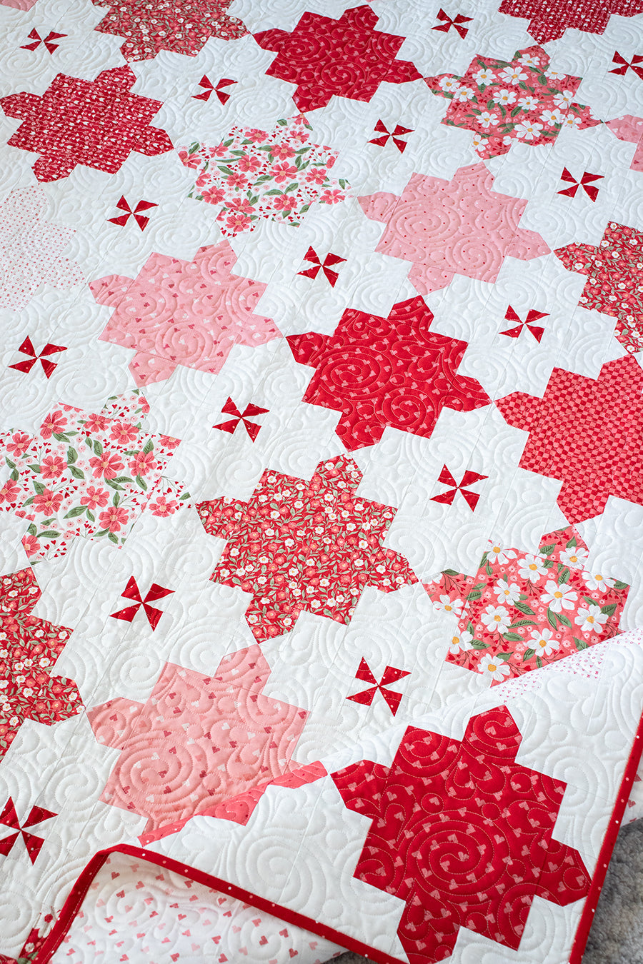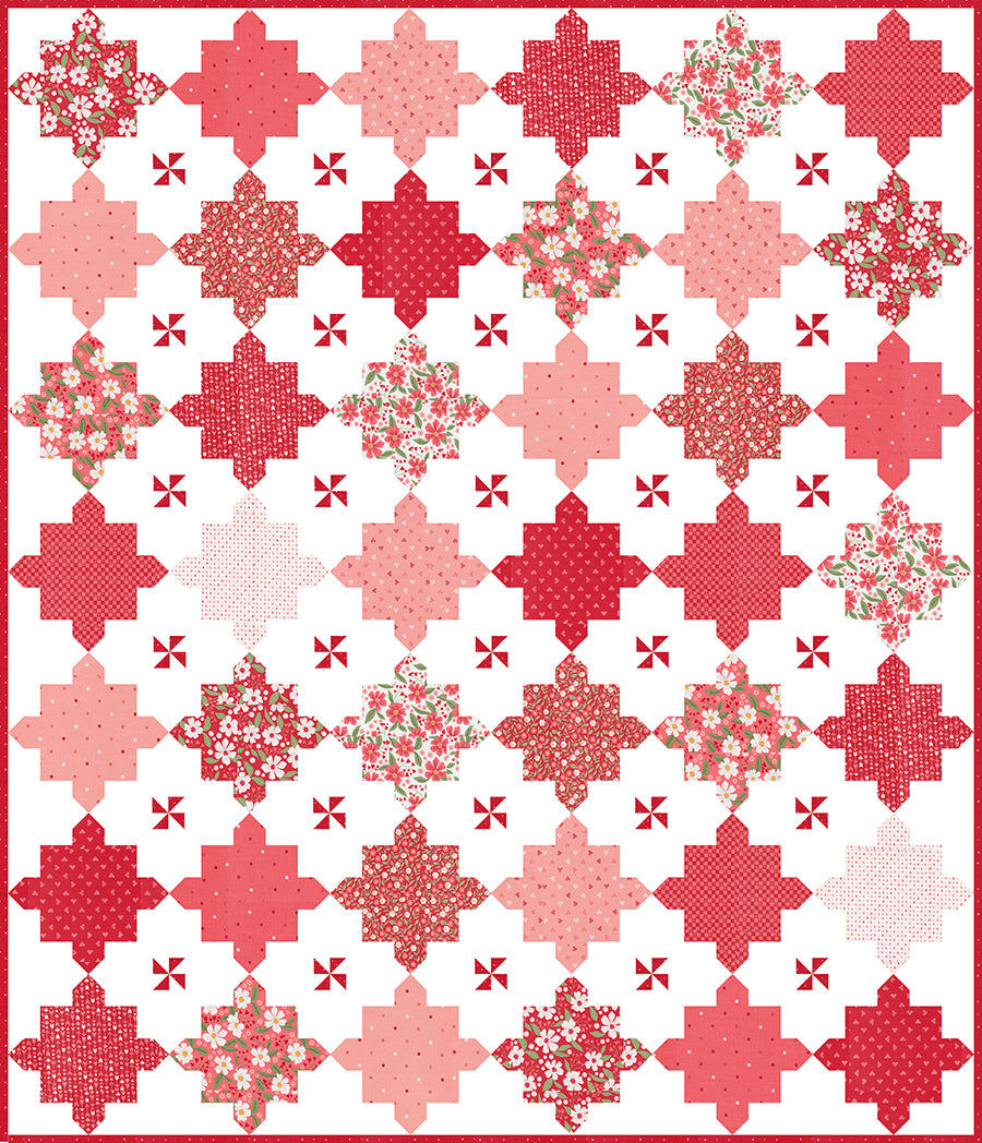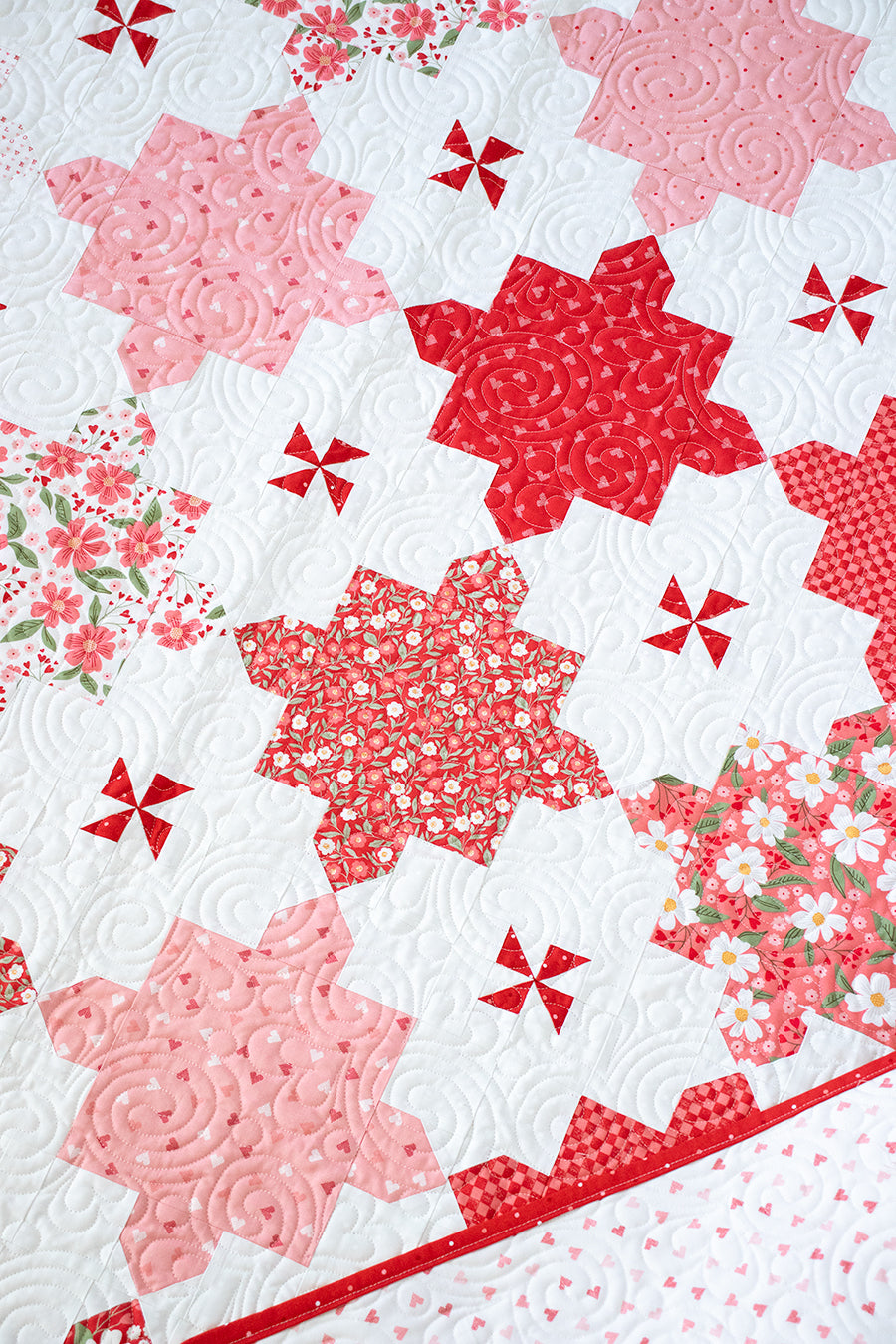 Fabric is Love Blooms by Lella Boutique for Moda Fabrics. White background print is Magic Dot SKU#5230 39 "Cloud." Red binding fabric is Magic Dot SKU#5230 32 "Strawberry."