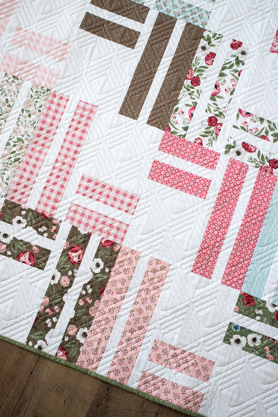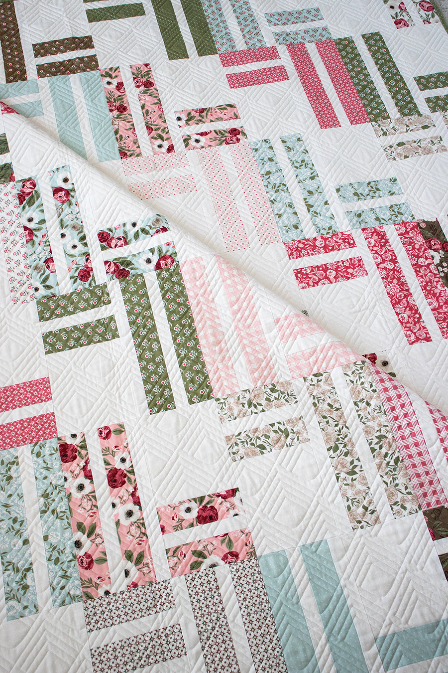This listing is for the original quilt model of my "Stairway to Heaven" pattern in Lovestruck fabric by Lella Boutique. Finished quilt size is 72-1/2" x 84-1/2". Model is in great condition - only use has been for display at shops/trade shows. Quilt has been stored in a pet free/smoke free environment.